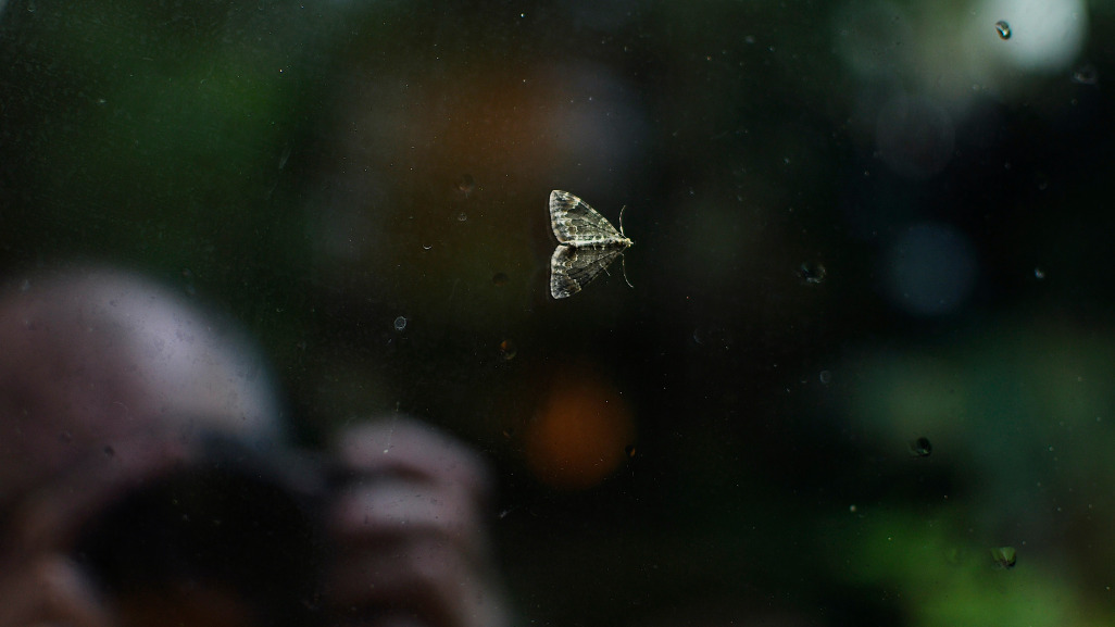 Here is a moth. I hide and seek the moth. He lands on the back door. I raise my camera and ... catch myself as well.