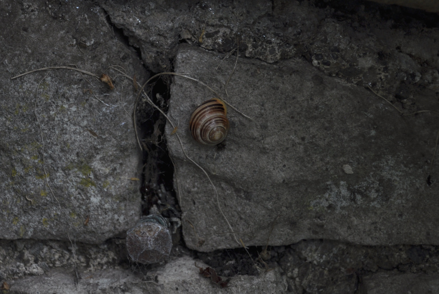 The rough stones, the solid bolt-head, the wispy threads - all in contrast to the beautiful, simple shape and subtle colour of the snail.